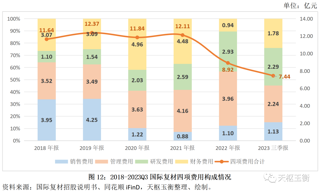 在四項費用方面,國際復材在2018-2021年間,其四項費用總額保持在每年12億元上下,但是各項費用的占比卻有變化;2022年,國際復材的四項費用大幅下滑,合計支出8.92億元;2023年前三季度,四項費用支出7.44億元。