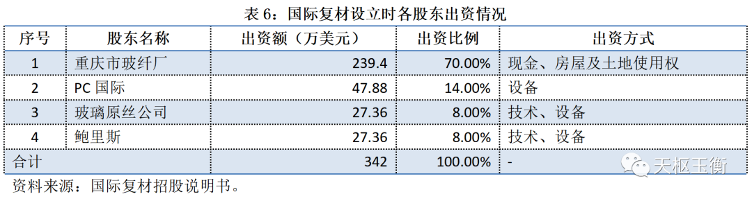 1991年6月1日,重慶市玻纖廠與PC國際、玻璃原絲公司、鮑里斯在重慶簽署了《合資經(jīng)營重慶國際復合材料有限公司合同》及《合資經(jīng)營重慶國際復合材料有限公司章程》,各方同意合資設立“重慶國際復合材料有限公司”,注冊地址為中國重慶市大渡口區(qū)庹家坳,注冊資本為342.00萬美元。