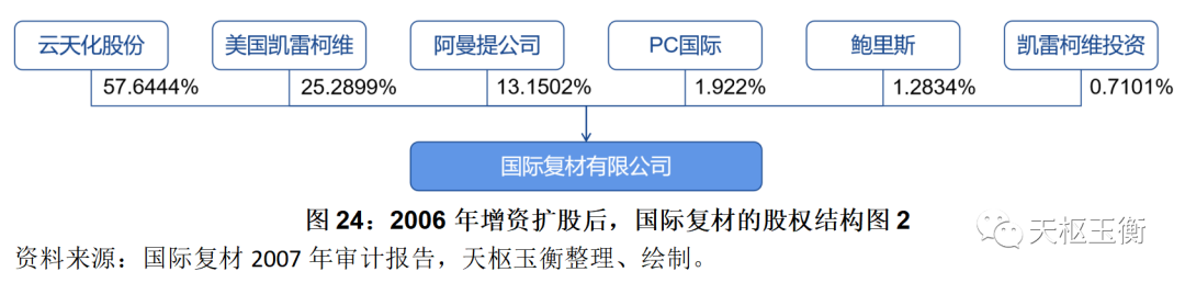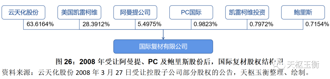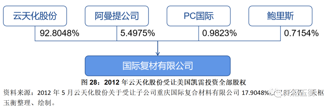 2012年5月,云天化股份受讓凱雷柯維有限公司和凱雷柯維共同投資有限公司持有國際復材17.9048%股權,交易價格為907,628,868.26元人民幣。至此,美國凱雷柯維及凱雷柯維投資不再持有國際復材的股權。