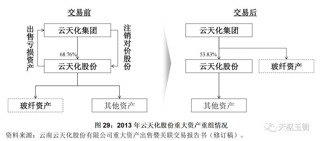 2012年和2013年上半年,云天化股份所持有玻纖業(yè)務板塊的三家子公司——國際復材、天勤材料、珠海復材——均出現(xiàn)較大程度虧損,于是在2013年11月,云天化股份啟動重大資產(chǎn)重組,將上述三家玻纖企業(yè)出售給云天化集團。