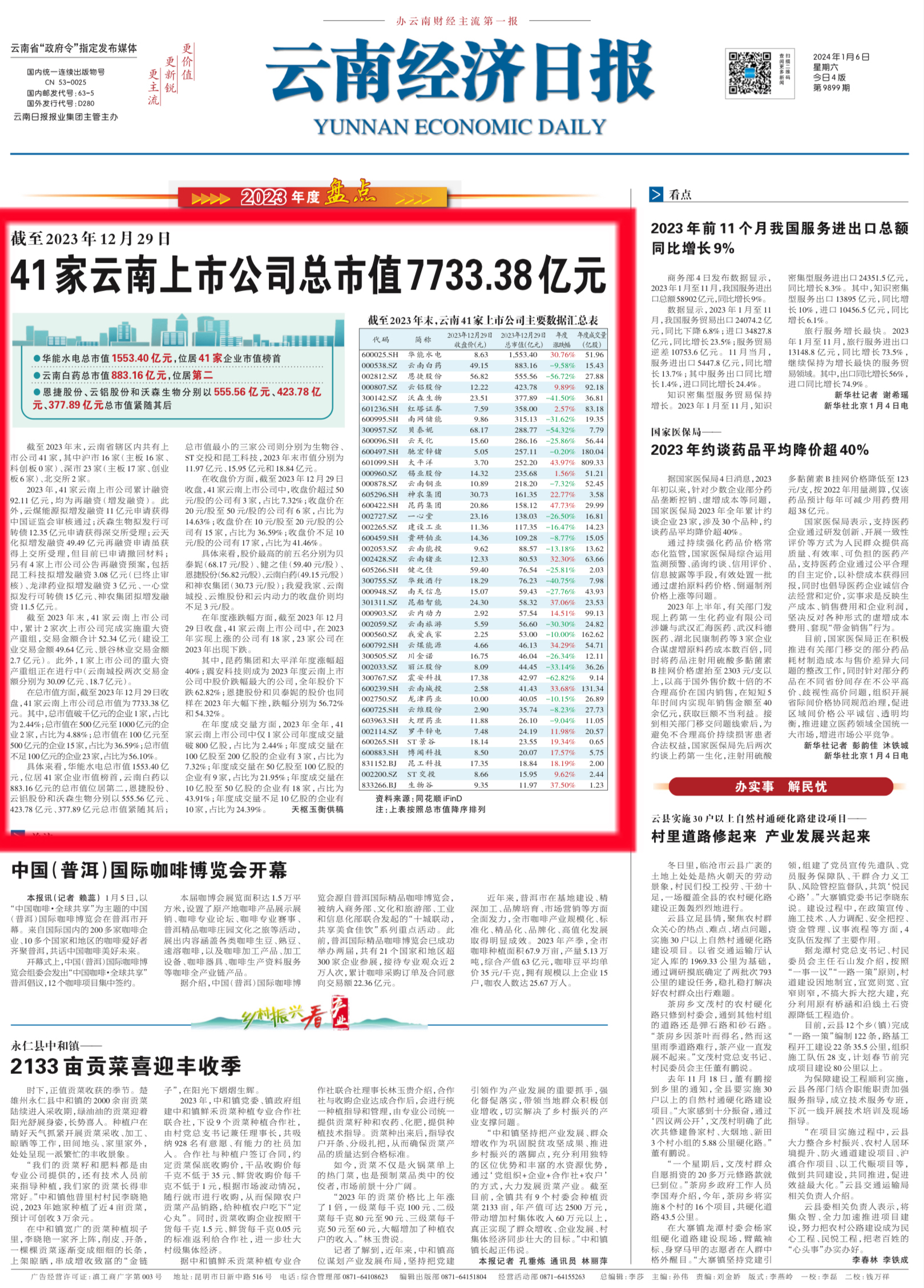 2024年1月6日,云南經(jīng)濟(jì)日?qǐng)?bào)頭版頭條發(fā)布了天樞玉衡供稿的《41家云南上市公司總市值7733.38億元》,并在云南經(jīng)濟(jì)日?qǐng)?bào)的微信公眾號(hào)、數(shù)字報(bào)等進(jìn)行了刊載。以下為報(bào)道原文: