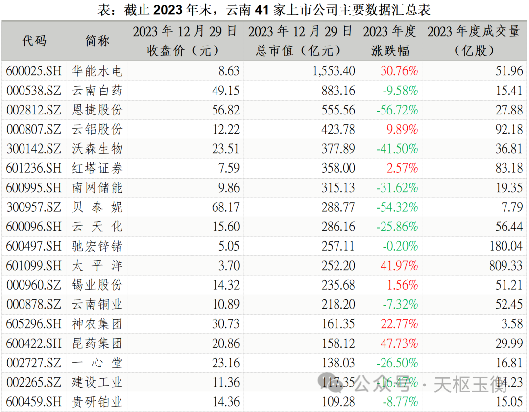 在年度漲跌幅方面,截至2023年12月29日收盤(pán),41家云南上市公司中,在2023年實(shí)現(xiàn)上漲的公司18家,23家公司在2023年出現(xiàn)下跌。